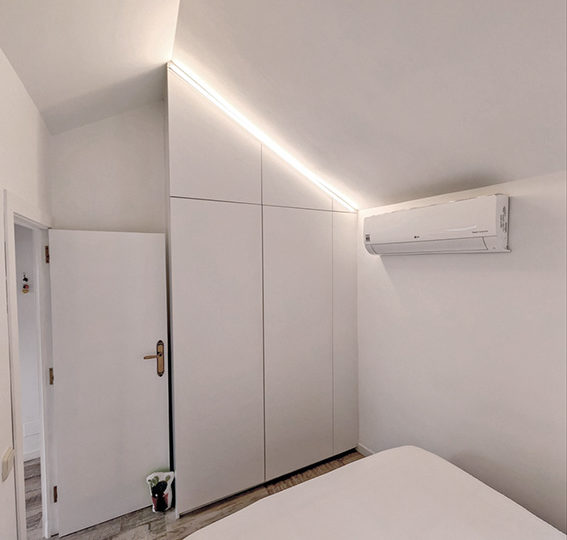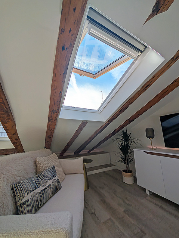 El dormitorio también es luminoso y da a los tejados del edificio lo cual le confiere luz y el encanto de despertarte viendo el cielo de Madrid.